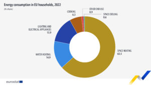 Na UE, a principal utilização de energia pelos agregados familiares é para aquecimento de casas (63,5% do consumo final de energia no setor residencial), seguido pelo aquecimento de água (14,9%). O aquecimento de espaços e de água representou consequentemente 78,4% da energia final consumida pelas famílias em 2022.