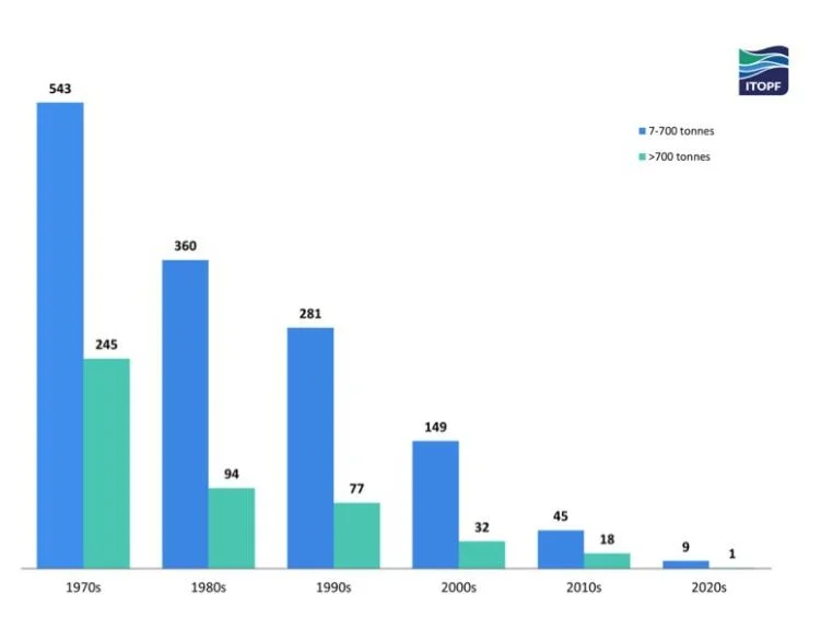 Na década de 1970 ocorreram em média cerca de 24,5 grandes derramamentos de óleo por ano, e fruto das medidas introduzidas ao longo dos anos, na década de 2010, o número médio de grandes derramamentos de óleo diminuiu para 1,7 derramamentos de óleo por ano.