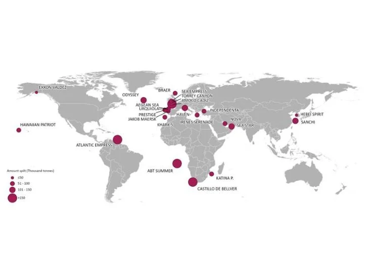 A maioria dos grandes derramamentos de óleo (superiores a 7 toneladas) registrados entre 1970 e 2021 foram causados por colisões e encalhes dos navios, sendo desconhecidas as causas dos pequenos derramamentos na maioria dos casos.