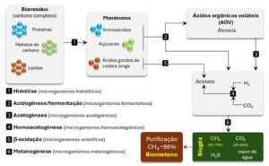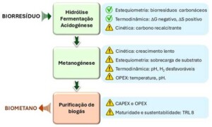 Do ponto de vista técnico, a digestão anaeróbia é uma sequência de reações bioquímicas levadas a cabo por comunidades de microrganismos anaeróbios, sob ambiente redutor, que convertem sequencialmente o carbono complexo contido nos resíduos orgânicos em formas mais simples até ao produto final, o biogás (uma mistura de metano, dióxido de carbono e outros componentes residuais). As etapas sequenciais consistem em: hidrólise; fermentação acidogénica; acetogénese/homoacetogénese; β-oxidação sintrófica; e metanogénese (ver Infografia 2). Estas etapas coexistem no mesmo espaço – um reator biológico – e beneficiam das vantagens que a biodiversidade traz à natureza, neste caso, também à microescala. As várias comunidades microbianas são fisiologicamente diferentes e sensíveis a ótimos ambientais distintos, mas operam em sintrofia, partilhando os intermediários químicos de cada etapa. O desempenho geral desta sequência é delicado e depende do controlo delicado das variáveis operacionais (temperatura, mistura, tempo de residência, pH, toxicidade da matéria-prima, etc.), mas também – e sobretudo – da natureza e da sazonalidade dos substratos submetidos ao processo de digestão anaeróbia (biorresíduos).
