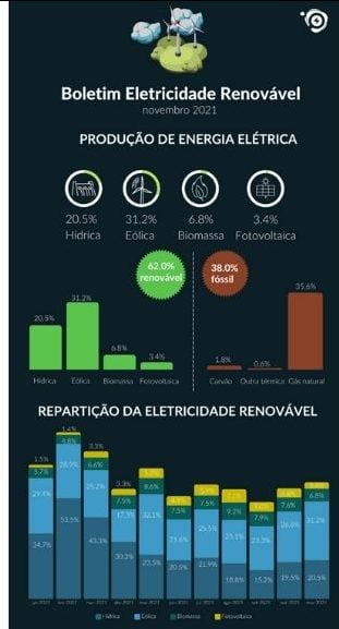 Segundo os mesmos dados, relativos ao mês de novembro, ao nível da produção de eletricidade, 62% teve origem em fontes renováveis (31,2% eólica, 20,5% hídrica, 6,8% biomassa e 3,4% fotovoltaica).