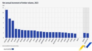 Para analisar o crescimento líquido do stock d emadeira, é necessário ter em conta as remoções e as perdas naturais, explica o Eurostat. 17 países registaram um aumento em 2023 face ao ano anterior. A Irlanda (+3,6%), Dinamarca (+3,2%) e Chipre (+1,6%) tiveram as taxas de crescimento mais altas, enquanto que vários países apresentaram declínios, incluindo a Lituânia (-1,8%), a República Checa (-1,7%) e a Estónia (-0,6%).