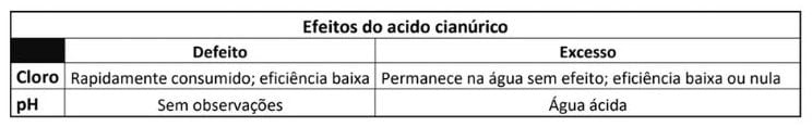 O cloro livre, o ácido cianúrico e os cloros isocianuratos existem em equilíbrio na água. À medida que o derivado dos cloros isocianuratos, o ácido hipocloroso, é consumido mais átomos de cloro são libertados. Contudo os níveis de ácido cianúrico também aumentam. O excesso de ácido cianúrico na água inibe o feito do produto desinfetante e retira capacidade algicida ao cloro, o que resulta muitas vezes em piscinas com água verde mesmo com níveis de cloro elevados (> 2 mg/l) e pH paramétricos (7.2 a 76).