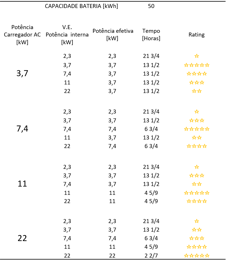 Nesta configuração (carregador embarcado de 11kW), os dois primeiros cenários são limitados pelo carregador, devendo preferir-se sempre carregadores de 11 ou de 22kW.