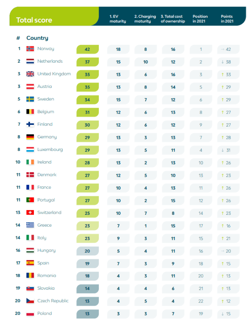 Ao nível de pontuação, a Noruega é a mais bem classificada em termos de prontidão de VE. A República Checa e Polónia classificadas como as mais baixas, enquanto a Grécia teve o maior aumento de pontuação em relação a 2021, de acordo com a análise.